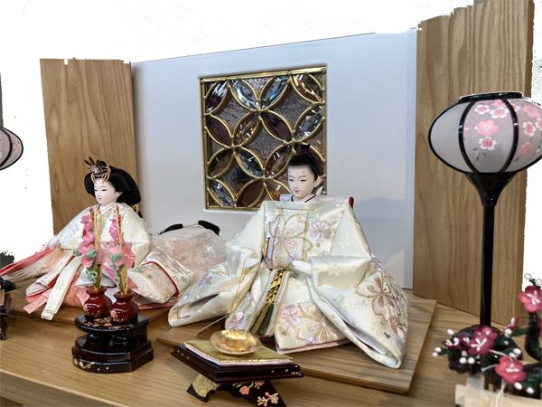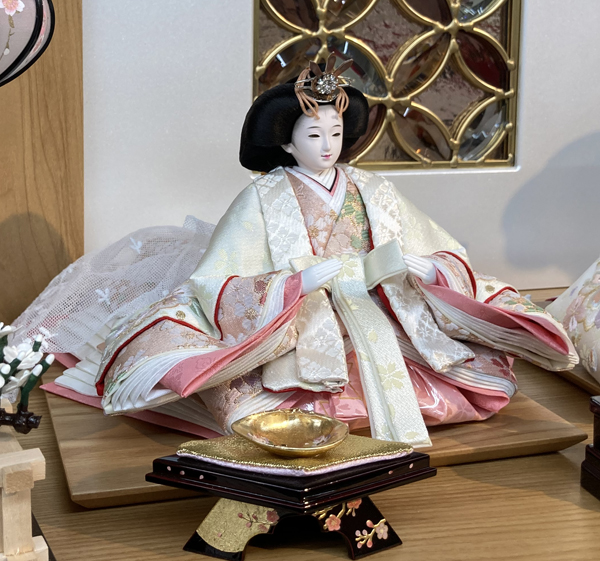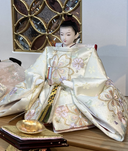 お人形の衣装も屏風にマッチして、白に桜の刺繍がきれいで、かわいらしいデザインになっております。