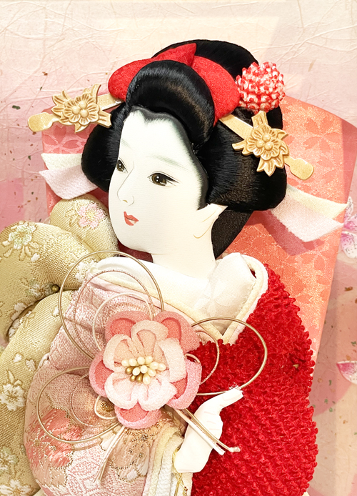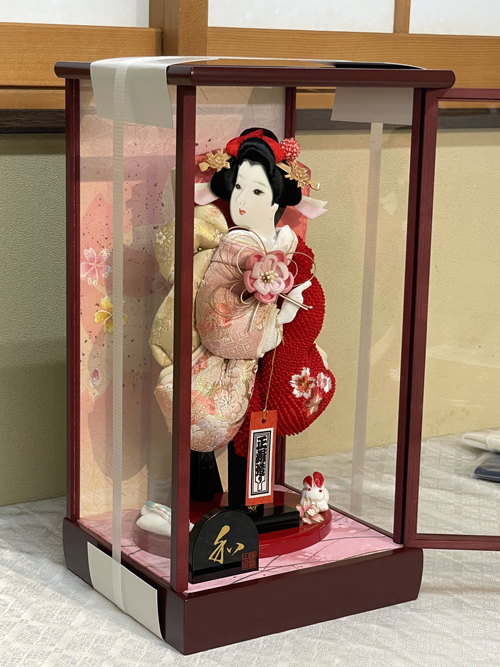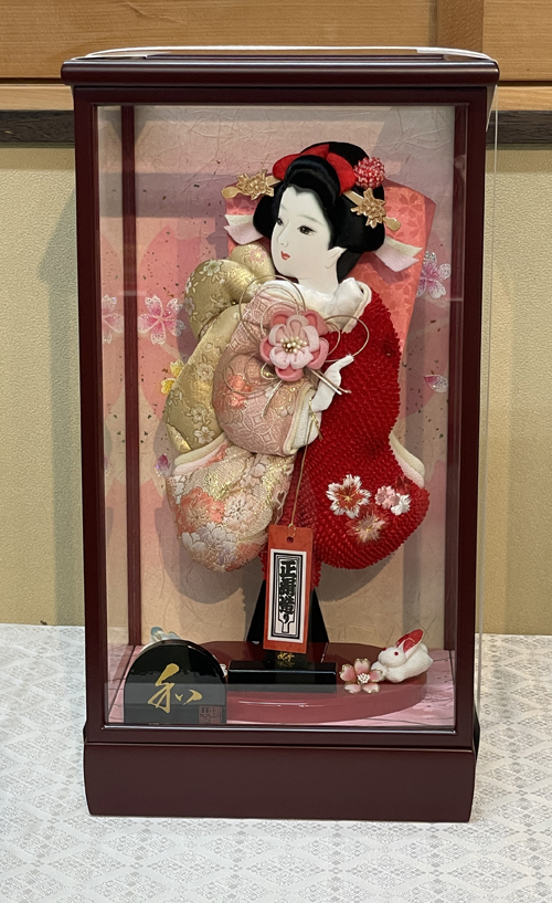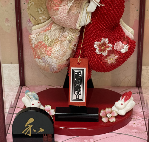 ケースは、ワインカラーの枠組み薄ピンクの内装足元のうさぎのオブジェが可愛いです。羽子板は、真っ赤な絞りに刺繍と白地の地厚な金襴で桜の絵柄となっています。シックさと華やかさを併せ持った羽子板飾りとなっています。