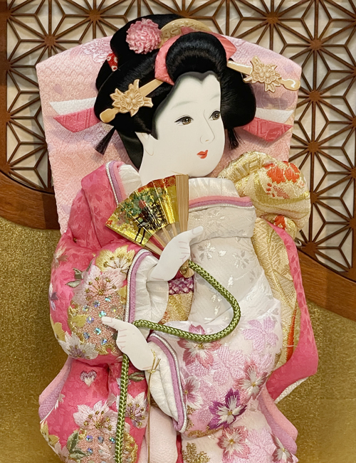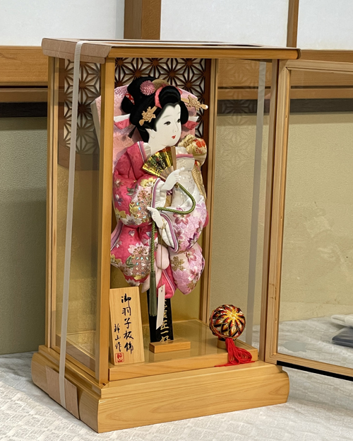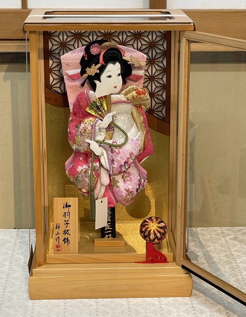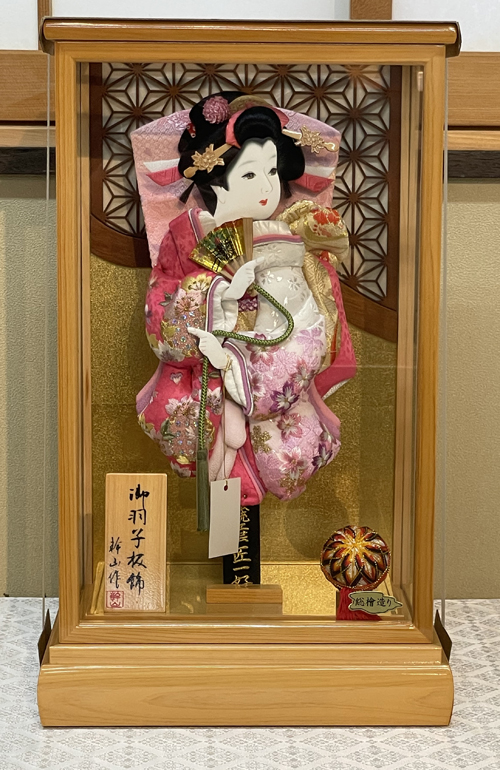 羽子板は、濃いピンクと白地の組み合わせで桜の刺繍と金彩が散りばめられており豪華な印象です、ケース、板ともに少しグレードアップした羽子板飾りとなっています。