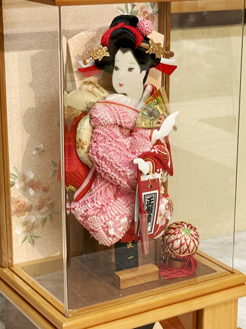 羽子板はピンクの鹿の子と赤地に紐と桜の柄でデザインされた刺繍を施してあります。