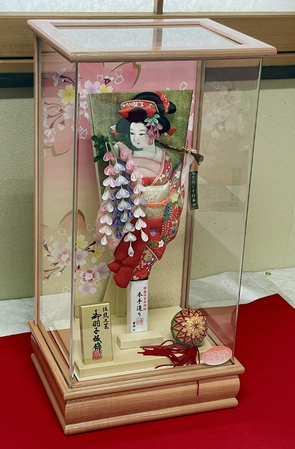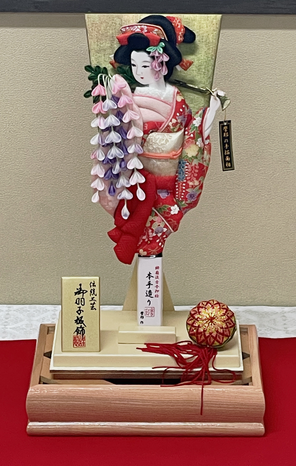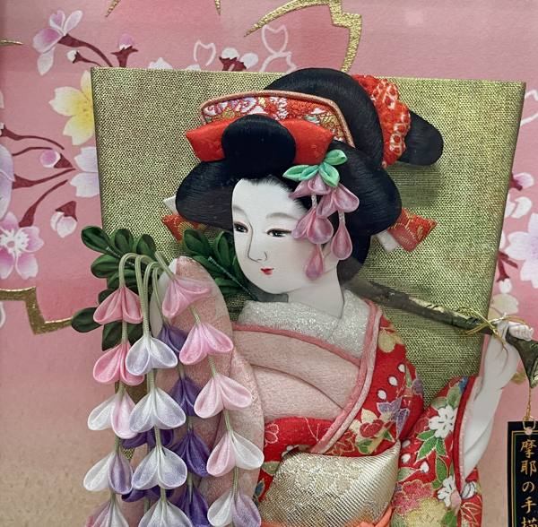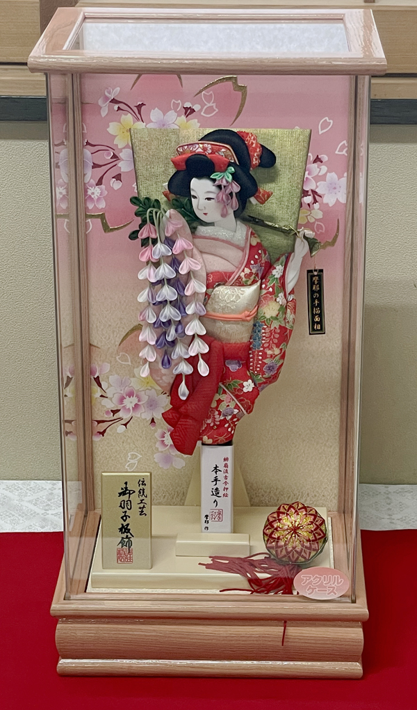 映画「国宝」より手描き面相で作った歌舞伎役者をモチーフにつくられた羽子板です。踊りは、藤娘衣装から小道具に至るまで、時間と技術を使った品物です。