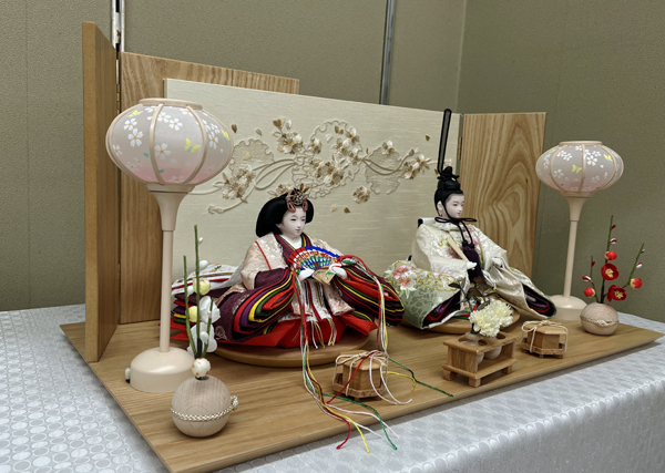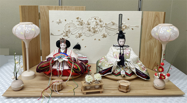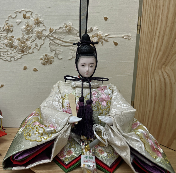 サイズは、間口55cm奥行30cm高さ27cm、明るい白木の台屏風のセットお人形は、厚手の生地に桜の刺繍です。