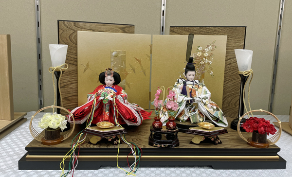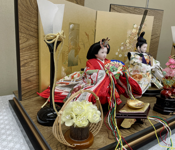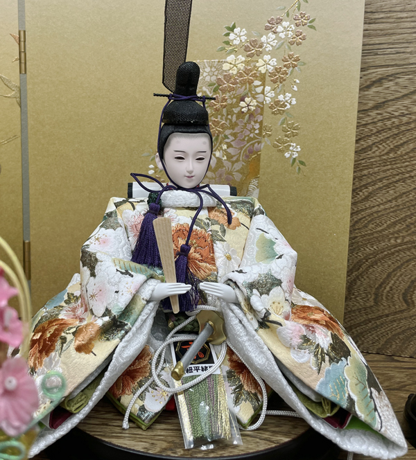 サイズは、間口55cm奥行30cm高さ32cm、木目の板に金の蒔絵を施した加工です。小ぶりで高級感のある台屏風です。またお人形は、白地に桜の刺繍です。